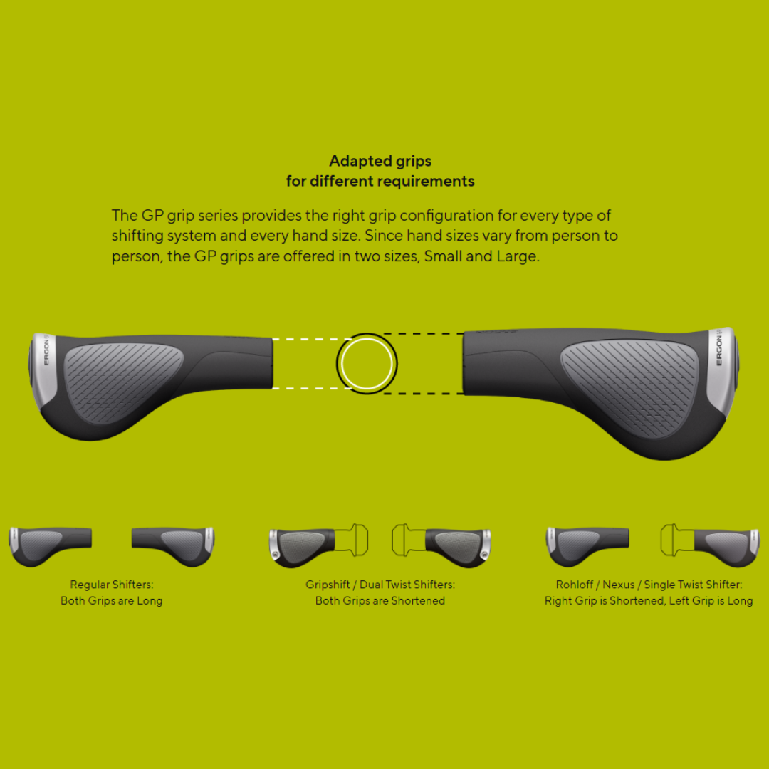 Ergon's GP Series of grips are available in special configurations for different shifting systems. For trigger shifters, both grips are the same length. For Gripshift or Dual-Twist-Shift, both grips are shortened. For Rohloff, Nexus and Single-Twist-Shift cyclists are provided a short right grip and full-length left grip.