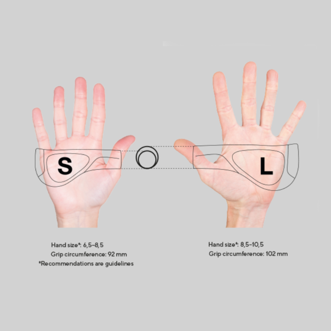 Ergon offers the GP1 Evo in sizes "Small" and "Large". The difference between the two sizes is the thickness of the grip in-hand as, to effectively distribute pressure on the handlebar and prevent discomfort, it is important that your hand does not completely enclose on the grips. A thicker grip provides an optimized fit for a larger hand, while a thinner grip is more advantageous for a smaller hand!