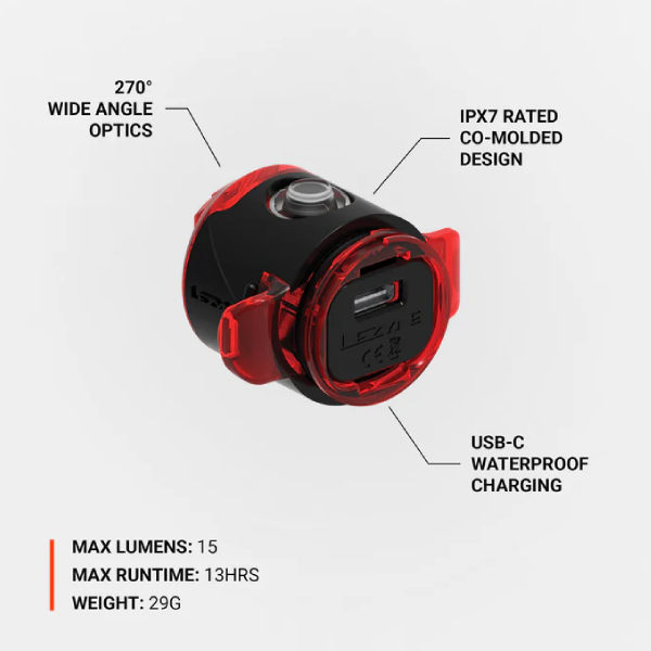 From the max output, highly disruptive 50-lumens Day flash Mode to the impressive 15-hour runtime in Femto mode, the Femto USB-C Front has a light mode suitable to a variety of riding situations. The Femto USB-C Rear has the ability to cut through urban landscape in a variety of conditions. Wide-Angle Optics provide 270° of visibility and the durable co-molded construction features an IPX7 water-resistance rating, ensuring optimal functionality in the toughest weather conditions.