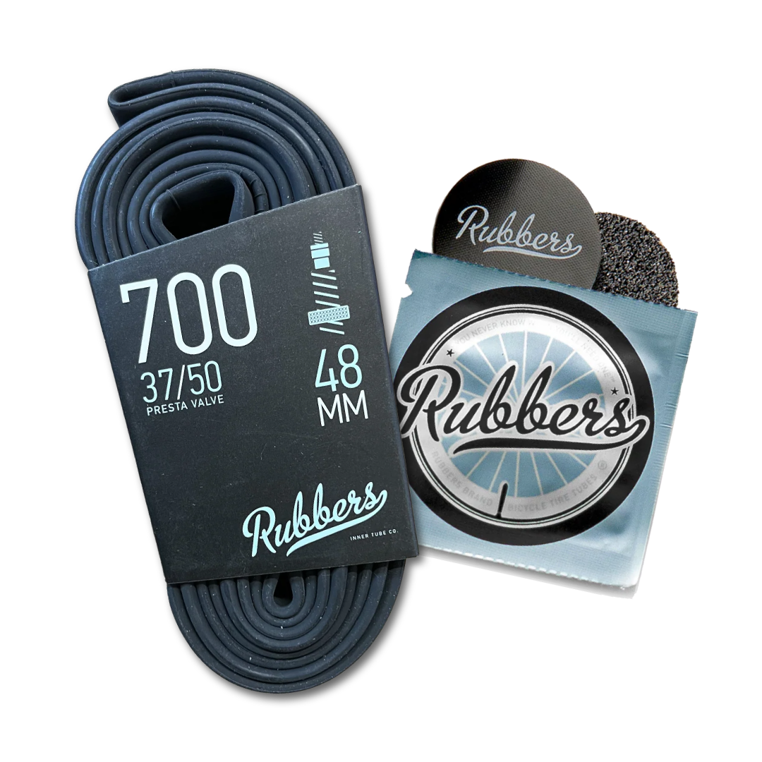 Rubbers decided to make inner tubes sexy again. No more clunky boxes and every tube comes with a self adhesive patch kit! Stick one in your wallet, a jersey pocket or saddle bag. After all, you never know when you'll need one!